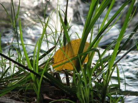 Leaf, grass, waterfall.